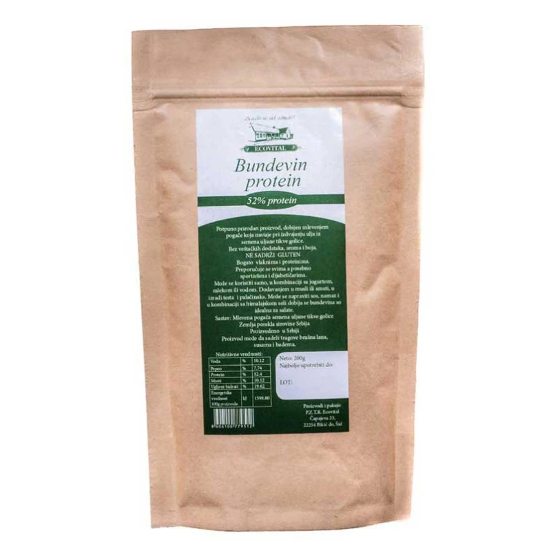 Bundevino brašno (bundevin protein) je potpuno prirodan proizvod dobijen mlevenjem pogače koja nastaje nakon hladnog ceđenja ulja iz semena uljane tikve golice. Bez ikakvih veštačkih dodataka, aroma i boja, predstavlja kvalitetan izvor biljnih proteina i vlakana, prirodno bez glutena.